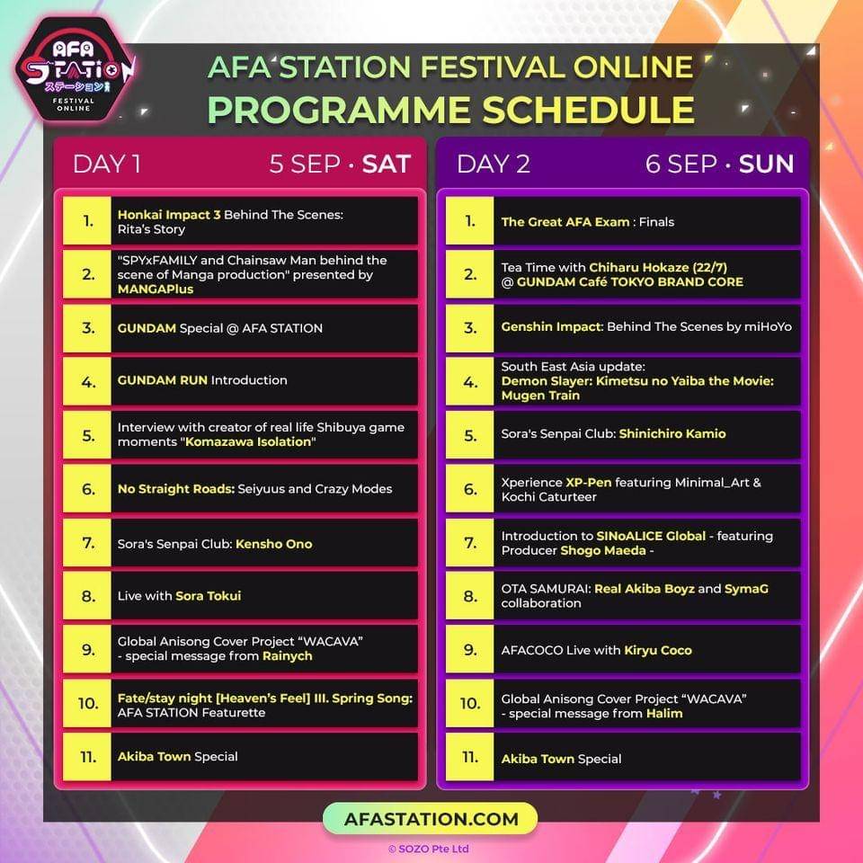 Karena akan segera tayang tidak lama lagi, AFA STATION akhirnya merilis daftar konten lengkap dari AFA STATION. Banyak artis langsung dari Jepang yang dihadirkan di sini, seperti Sora Tokui, Chiharu Hokaze dari 22/7, Noriko Shitaya yang merupakan seiyuu dari Sakura dalam Fate/stay night, REAL AKIBA BOYZ, Chiaki Kobayashi, dan SYMAG. Lalu ada konten eksklusif dari game NO STRAIGHT ROADS, HONKAI IMPACT 3rd dan GENSHIN IMPACT, serta SINoALICE.