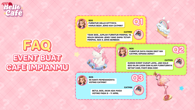 Untuk bisa bergabung dalam event ini, para pemilik kafe di Hello Café setidaknya harus memenuhi beberapa syarat sederhana, di antaranya harus memiliki minimal 15 furnitur kolaborasi Hello Café x Hello Kitty dalam 5 jenis furnitur yang berbeda. Bagi yang sudah memiliki furnitur tersebut, mereka bisa segera mendekorasi kafe mereka dan berpartisipasi dalam event ini. Menariknya, furnitur-furnitur ini bisa diperoleh secara gratis di dalam game, tanpa perlu merogoh kantong sedikitpun.