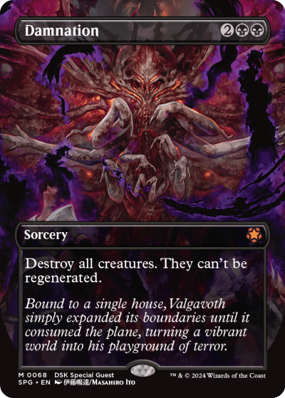 Mereka yang ingin mendapatkan beberapa Collector Booster juga dapat menemukan kartu-kartu Showcase Jepang. Kartu-kartu yang sangat langka ini, dan varian Fracture Foil yang lebih langka lagi, akan menampilkan gaya seni dari ilustrator dan seniman Jepang yang terkenal. Ini termasuk kartu Special Guest “Damnation” yang menakutkan dari desainer makhluk Silent Hill, Masahiro Ito, yang menampilkan iblis sesepuh Duskmourn, Valgavoth!